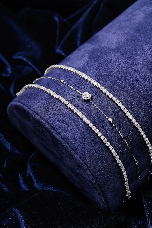 A pulseira Riviera de moissanite é composta por uma sequência contínua de pedras lapidadas em formato brilhante, garantindo máximo reflexo de luz. Cada moissanite é cuidadosamente cravejado em garras, proporcionando segurança e um acabamento uniforme.