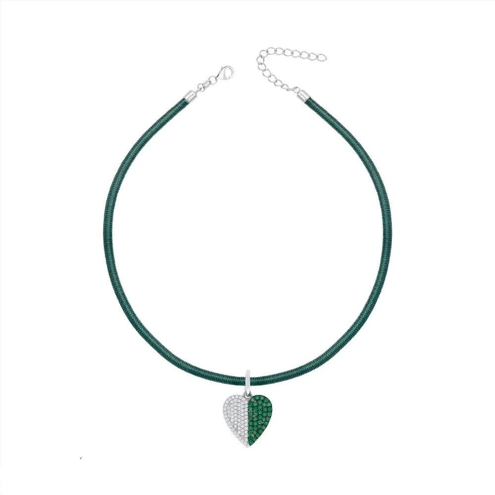 Colar confeccionado em fios de seda verde. Fecho em prata 925, no banho de ródio branco.