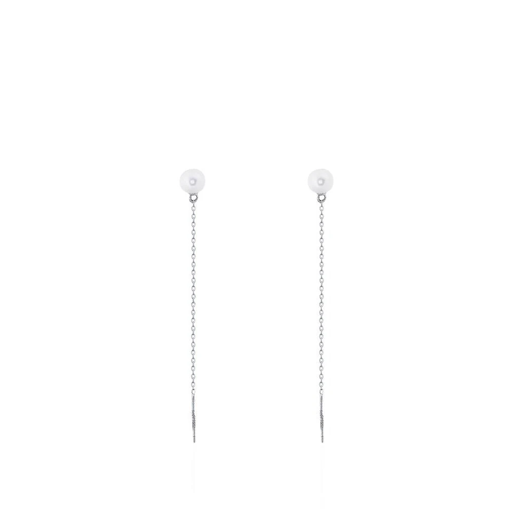 Brinco de pérola com corrente, confeccionado em prata 925 e banho de ródio branco.