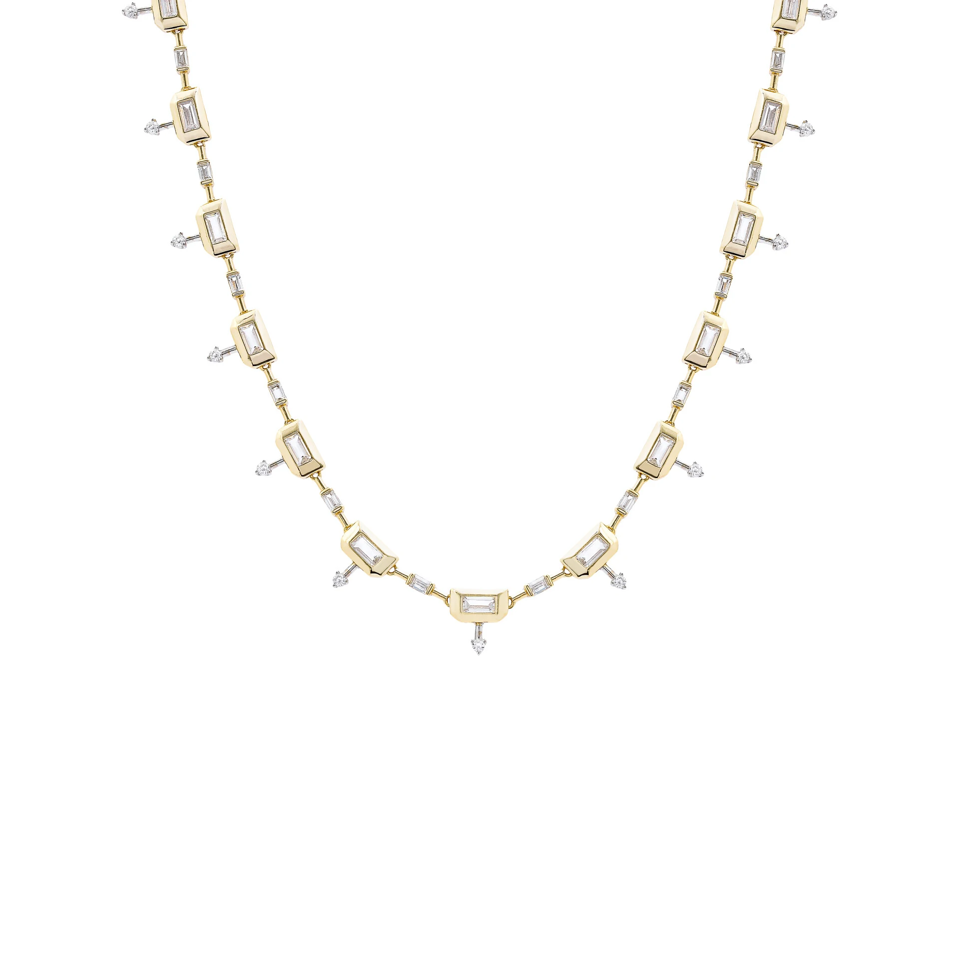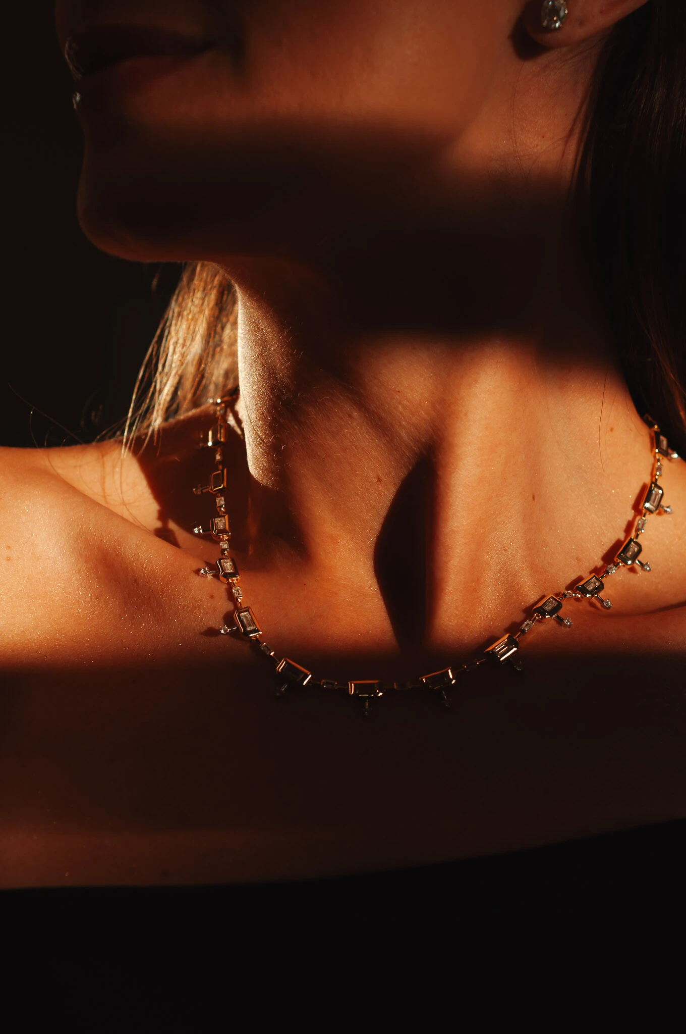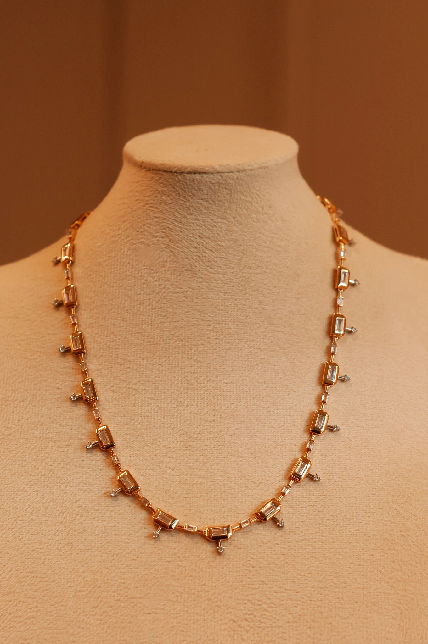 Colar confeccionado na prata 925, no banho de ouro amarelo 18k. Cravação de baguetes e pontos de luz em zircônia.