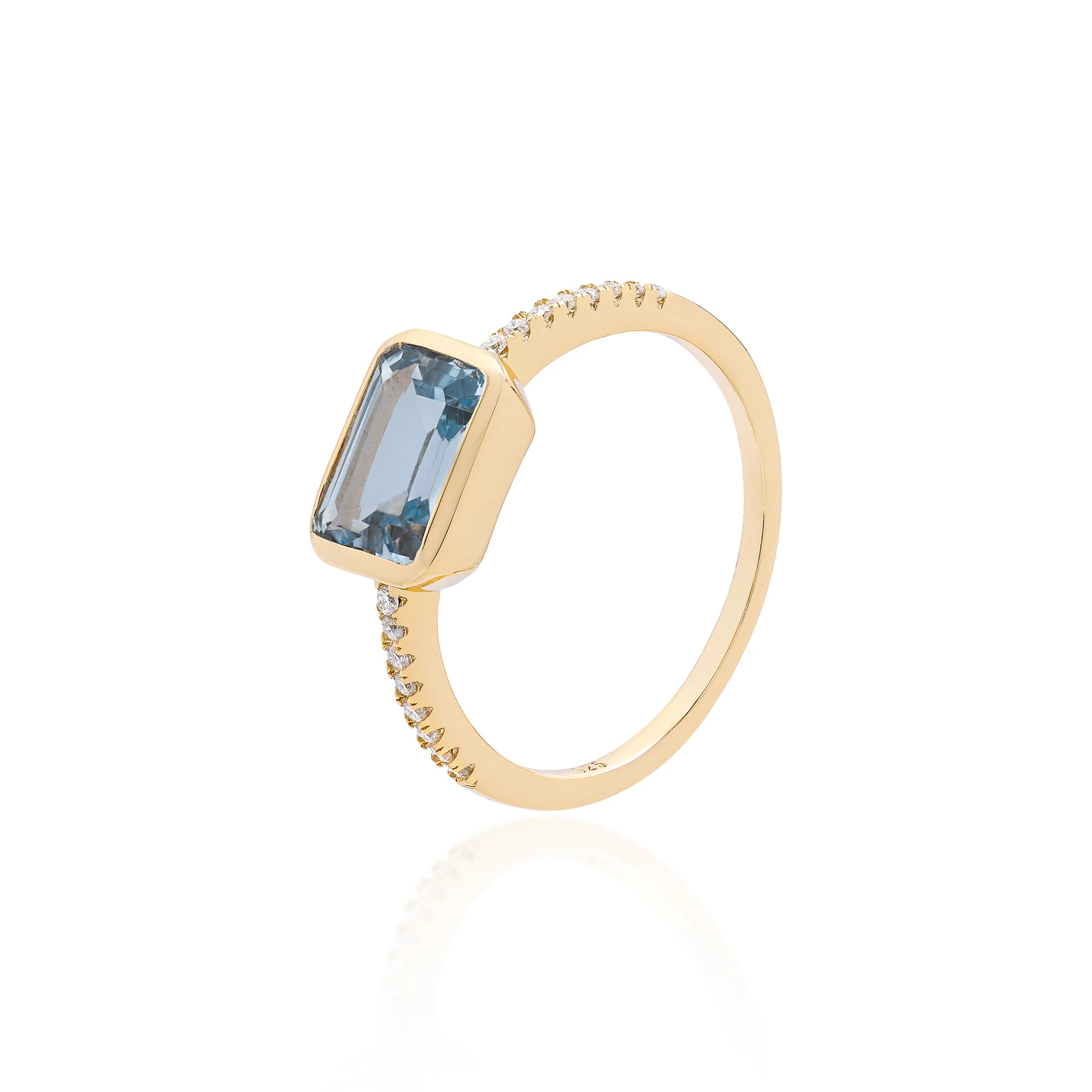 Pedra retangular natural Topázio Sky, e meia cravação em Moissanite.