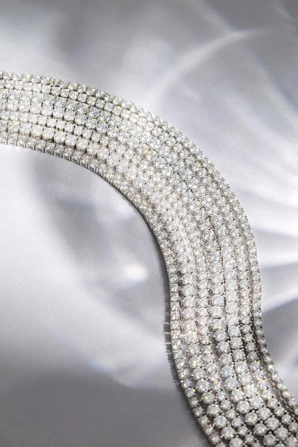A pulseira Riviera de moissanite é composta por uma sequência contínua de pedras lapidadas em formato brilhante, garantindo máximo reflexo de luz. Cada moissanite é cuidadosamente cravejado em garras, proporcionando segurança e um acabamento uniforme.