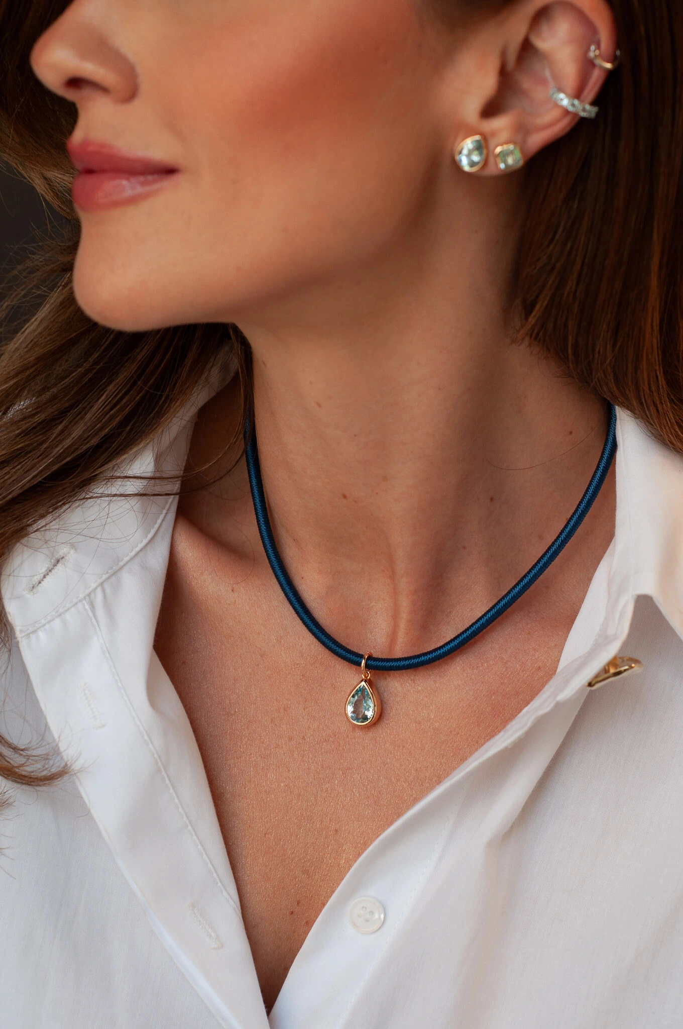 Colar confeccionado em fios de seda. Fecho em prata 925, no banho de ouro amarelo 18k. Pingente de pedra natural Topázio Sky, em cravação inglesa.
