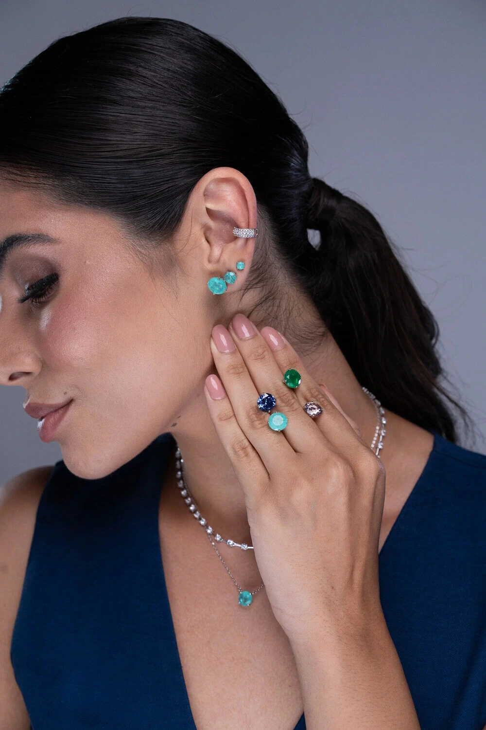 A zircônia colombiana se destaca pelo brilho preciso e pela pureza do tom verde-água — uma cor que habita o limite entre o céu e o mar. Translúcida e serena, reflete equilíbrio e frescor, revelando um encanto que nasce da leveza.