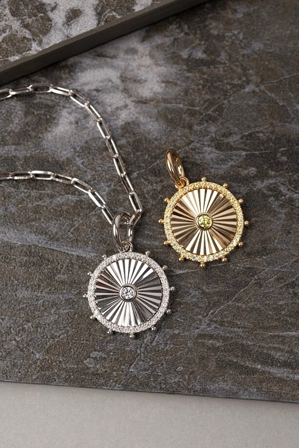 Pingente redondo raiado com cravação inglesa central, borda cravejada e bolinhas polidas fixas na lateral.