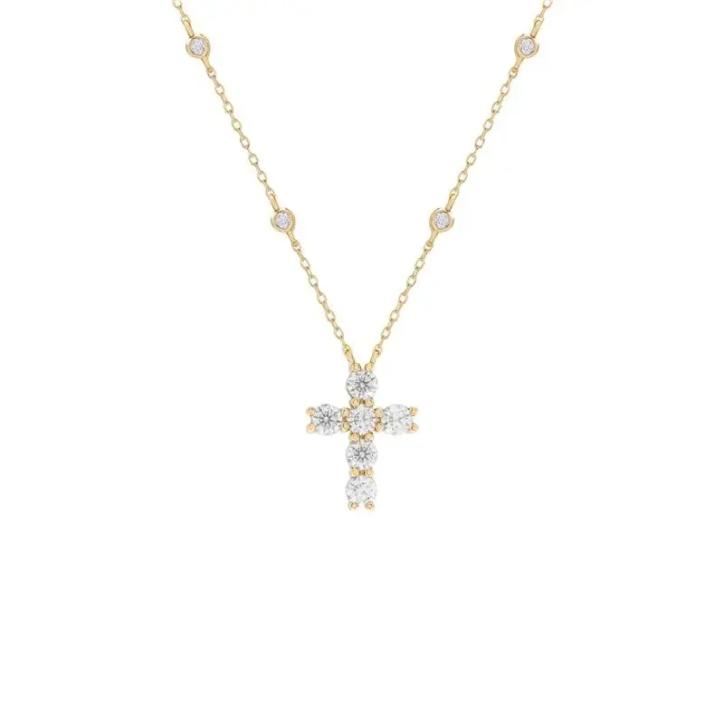Uma cruz que reflete o brilho da fé. O moissanite simboliza a luz que nunca se apaga.
