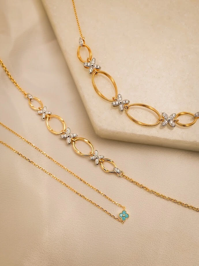 Malha italiana com 3 flores de 4 petalas com cravação em Zircônia incolor.