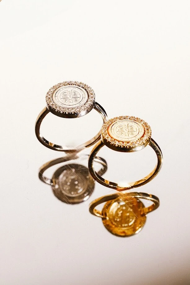 Anel confeccionado na prata 925 com banho de ouro 18k, medalha de São Bento com bordas cravejadas.